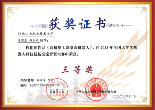 近日,由共青团中央、工业和信息化部共同主办的2023年全国大学生机器人科技创新交流营暨机器人大赛决赛获奖名单公布,乐鱼网页版推荐的作品《高精度七彩桌面机器人》荣获三等奖。