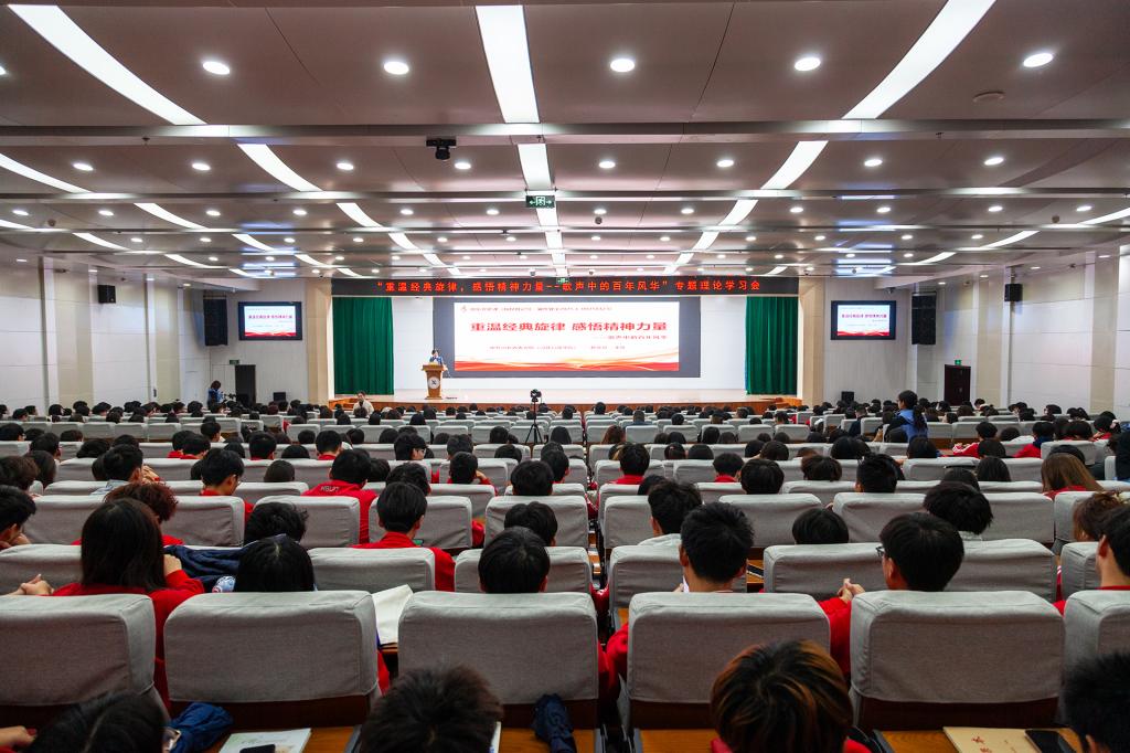活动现场气氛热烈、座无虚席。随着《黄河大合唱》等经典红色歌曲的播放,熟悉的旋律瞬间点燃了全场师生的爱国热情。李芬与赵会分两位教授以百年党史为脉络,以经典红色歌曲为载体,通过“史实讲述+音乐赏析+精神解读”的多元方式,将《国际歌》《没有共产党就没有新中国》等一首首镌刻着时代印记的经典作品背后的创作背景、历史故事及其蕴含的抗战精神、民族气节和爱国情怀娓娓道来。两位教授的讲解史料翔实、逻辑清晰,时而还会跟随音乐高声歌唱,极富感染力和吸引力。