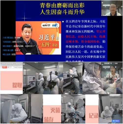使命担当,同心聚力直面疫情。高伟以“责任担当,牢记使命”为题,生动地讲述了支援武汉期间防疫队员们舍生忘死、奋战一线的感人故事,让师生们看到了疫情研判、公共场所消杀等内容背后的抗“疫”内容。而朱怡青也让同学们了解到“核酸检测”的场所和工作台,当她放映出自己被裹成“面包”依然坚持高强度工作的照片时,课堂上所有人为之动容,纷纷竖起大拇指,向“逆行者”留言致敬!