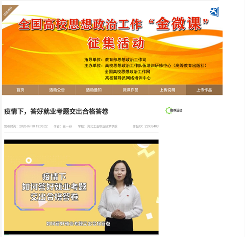 两部微课作品中,互联网学院张一丹老师的《疫情下,答好就业考题交出合格答卷》,把疫情这场席卷全国的“特殊战役”中的素材转化为实用而鲜活的教材,从就业形势、国家政策、求职技巧三个方面入手,分析了就业层面“危”中有“机”,并结合疫情背景,提出不同以往的求职侧重点,为学生的思想注入引领动力。引导学生感受到中国特色社会主义制度优越性的同时,能够确立正确的人生观价值观就业观,从容应对、顺利就业,交上抗疫大考的“青春答卷”。新闻宣传中心陈思老师以《捧滚烫初心 做奔涌后浪》为题,以00后”高考后感到迷茫的状态为背景,结合当前新冠肺炎疫情、近期的严峻汛情以及毕业季习近平总书记的重要回信精神,从迷茫找初心、选择悟初心、奋斗践初心三个方面层层递进,鼓励广大青年投身伟大实践中攻坚克难、顽强斗争,在为人民利益的不懈奋斗中书写人生华章。