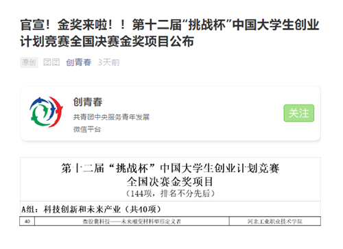 近日,由团中央、教育部、中国科协、全国学联等单位联合主办的第十二届“挑战杯”中国大学生创业计划竞赛全国决赛落下帷幕。大赛吸引了包括港澳在内的全国2786所高校的17.9万个项目报名参赛,432个参赛作品入围全国终审决赛答辩,我院两个项目成功晋级决赛。其中,《微胶囊科技——未来相变材料塑形定义者》项目层层突围,荣获科技创新和未来产业组金奖,实现学院在此项比赛的历史性突破。