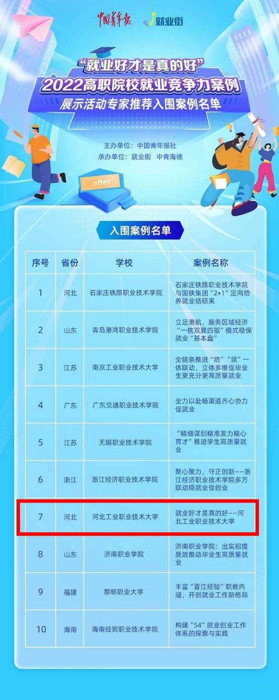 据了解,本次活动是由中国青年报社主办,就业街、中青海德承办,自去年8月下旬起,面向全国高职院校征集开展,并在一众优秀案例中,挑选54所院校进入展示阶段。这些案例分别来自全国23个省市区,其中“双高校”30个,占比55.5%,综合性和行业性院校各具特色。在经各方专家斟酌讨论、广泛展示推广后,包括乐鱼网页版在内的10所院校脱颖而出,入选本次“2022高职院校就业竞争力案例”。