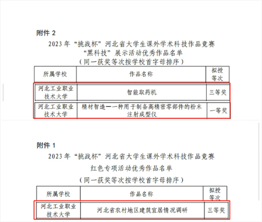 近日,2023 年“挑战杯”河北省大学生课外学术科技作品竞赛“黑科技”展示活动、红色专项活动优秀作品名单公布,乐鱼网页版学生项目《精材智造——一种用于制备高精密零部件的粉末注射成型仪》荣获“黑科技”展示活动一等奖、《智能取药机》荣获“黑科技”展示活动三等奖、《河北省农村地区建筑宜居情况调研》荣获红色专项活动三等奖。