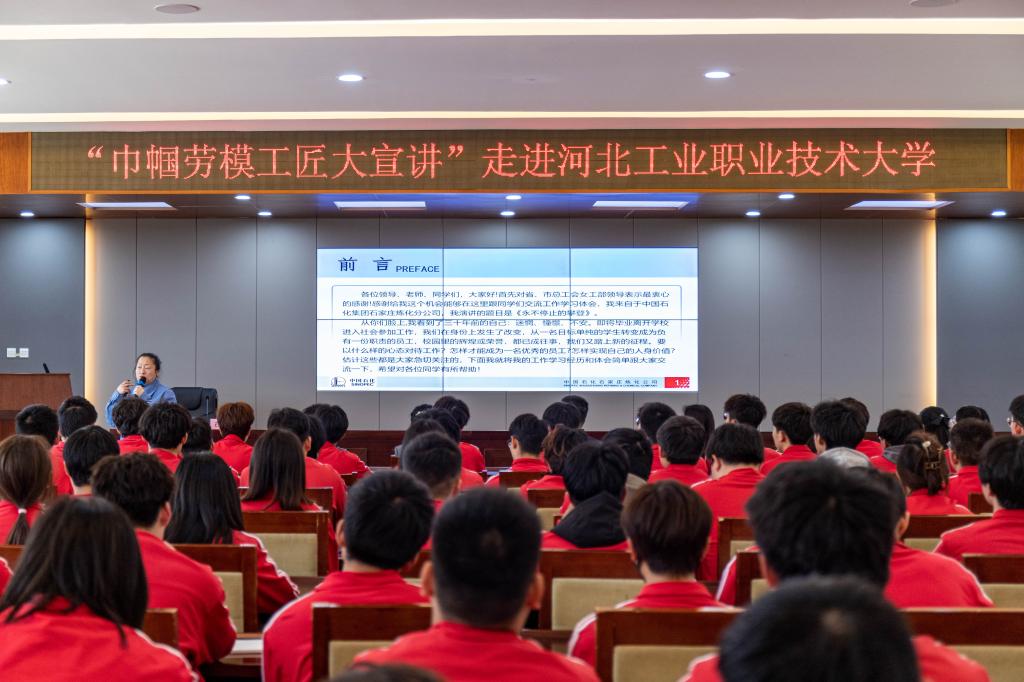 本次活动邀请中国石油化工股份有限公司石家庄炼化分公司首席技师、河北省劳动模范石晓棠,河冶科技股份有限公司能源管理负责人,特钢企业协会节能环保专家,河北省五一劳动奖章获得者杨瑛娣两位劳模作专题报告。石晓棠以“永不停止的攀登”为主题分享了她工作30多年来的奋斗故事。她凭着不服输的韧劲和异于常人的恒心,从一名普通的操作工成长为集团公司技能大师,带领团队取得创新成果200余项,获得国家专利两项的先进事迹,深刻诠释了劳动光荣、技能宝贵、创造伟大的工匠精神。杨英娣以“不负青春韶华成为更好的你”为主题,分享了她扎根科技创新、节能减排一线的成长经历。讲述了她在创建杨瑛娣炉窑创新工作室,蓄热式节能燃烧技术和节能保温材料创新与应用方面的多项节能技术改造的工作经历。她不断追求卓越、精益求精的工作态度、深刻诠释了劳动光荣、技能宝贵、创造伟大的工匠精神。