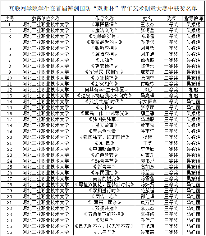 互联网学院学生在首届铸剑国防“双拥杯”青年艺术创意大赛中获奖名单