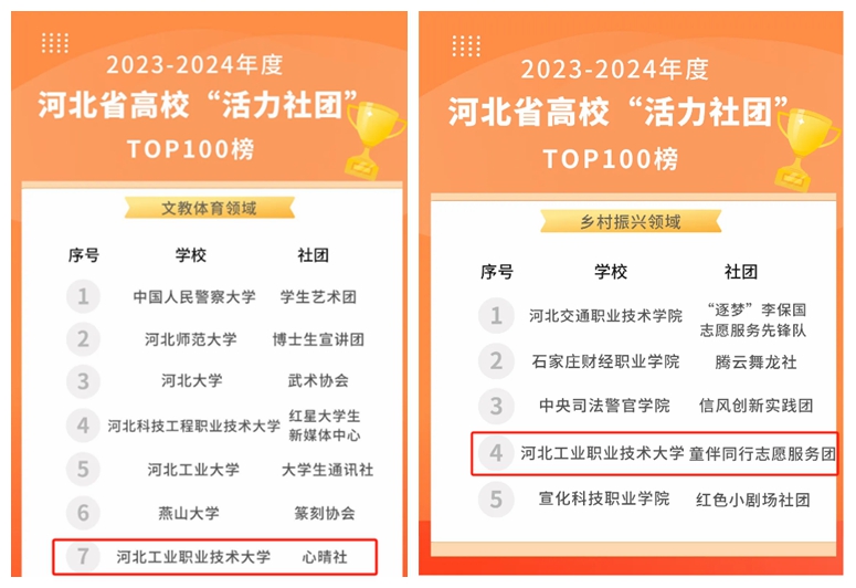 日前,由共青团河北省委组织评选的《2023-2024学年河北省“活力社团”TOP100榜》结果揭晓,经学校推荐报名、团省委评审,结合日常工作开展情况,乐鱼网页版心晴社、童伴同行志愿服务团分别入选文教体育领域、乡村振兴领域活力社团。