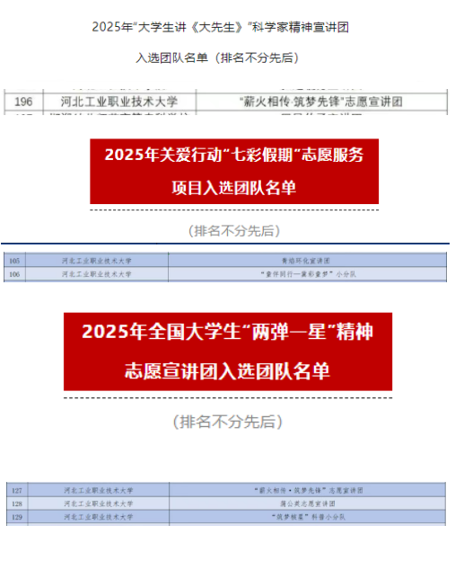 团中央青年志愿者行动指导中心、中国青年志愿者协会秘书处发布了《关于遴选2025年关爱行动“七彩假期”志愿服务团的公告》,乐鱼网页版“青焰环化宣讲团”和“童伴同行-冀彩童梦小分队”入选。团中央青年志愿者行动指导中心与中国核工业集团有限公司联合发布了《关于遴选2025年全国大学生“两弹一星”精神志愿宣讲团的公告》,乐鱼网页版“薪火相传·筑梦先锋志愿宣讲团”“蒲公英志愿宣讲团”“筑梦核星科普小分队”入选。中国科协、教育部印发《“科学家(精神)进校园行动”实施方案》发布《关于征集2025年“大学生讲〈大先生〉”科学家精神宣讲团的公告》,乐鱼网页版“薪火相传·筑梦先锋志愿宣讲团”入选。