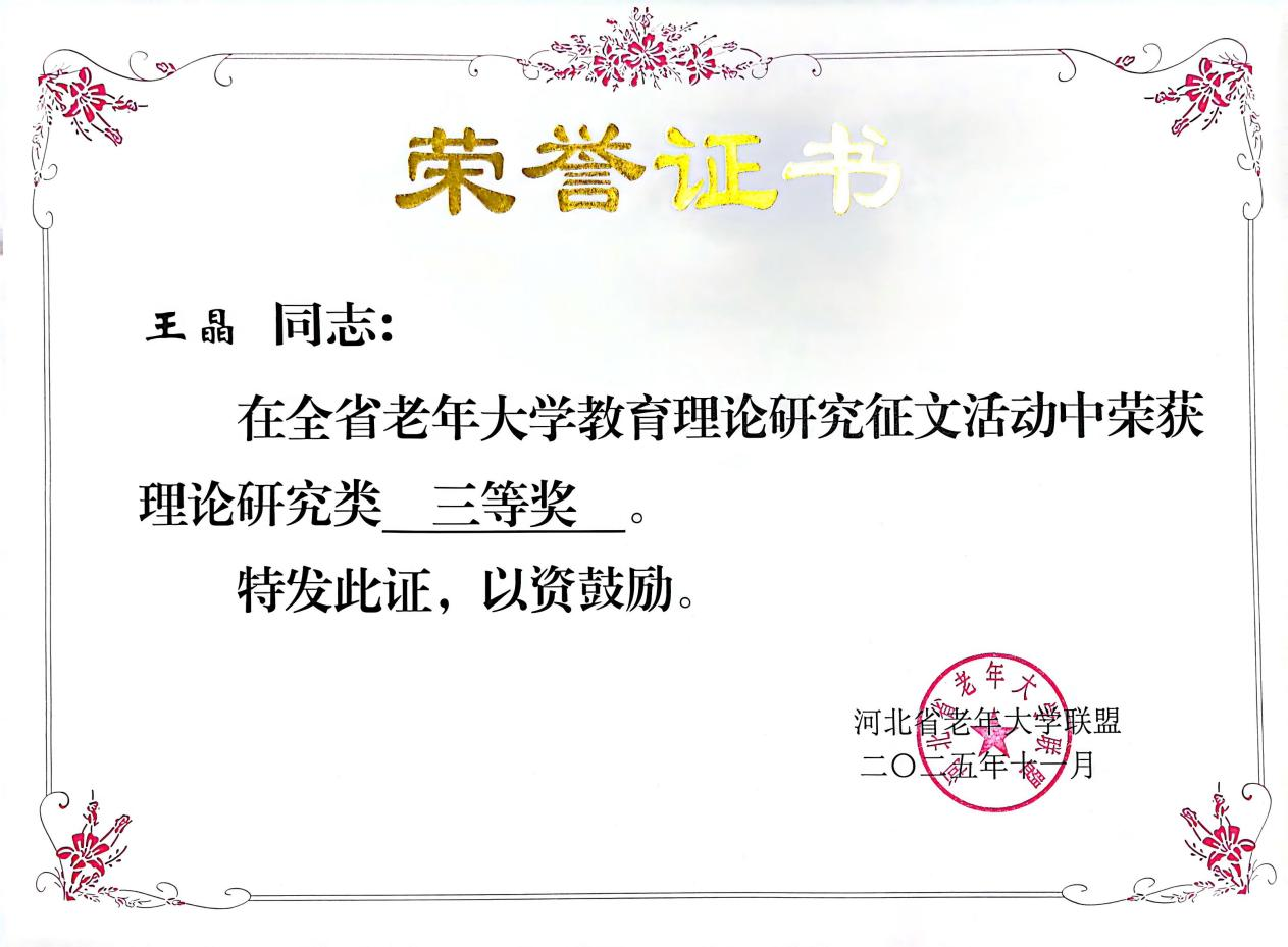近日,河北省老年大学联盟公布了2025年老年教育理论研究征文活动评选结果,乐鱼网页版老年教育部王晶老师撰写的《“数字鸿沟”背景下城市社区老年智能技术教育的路径探索——特征、困境与对策》和陈媛老师撰写的《心怀大我,情暖银发:老年教育中的教育家精神探索》双双荣获理论研究类三等奖。