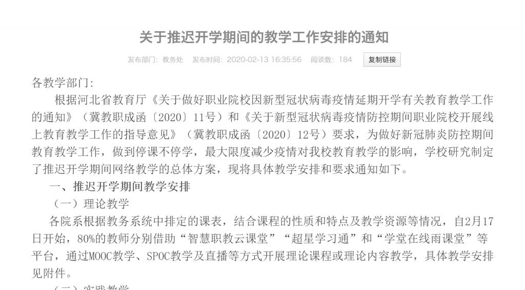 各系部高度重视并认真落实,分别制订了各部门《关于新学期开展“互联网+”教学工作的实施方案》《关于防疫期间加强教学工作的通知》等文件,并专门建立了“疫情期间系级教育教学群”、“系部教学督导监控群”等多个线上教学管理服务群,在16日之前,各教学系部已组织教师进行了多次线上教学测试,并针对平台可能出现的故障或是网络卡顿等做好了一到两套应急预案。