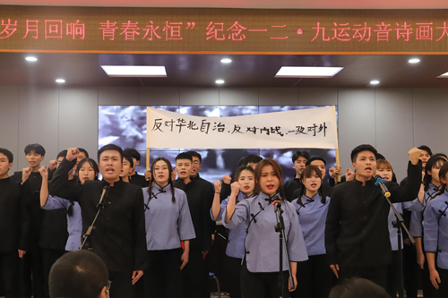 比赛由各系代表抽签决定出场顺序,依次进行音诗画表演。节目《听,这就是青年的声音》使我们仿佛听见那激越高昂的呼声穿越八十五年时光隧道正清晰响在耳边;《回望一二九 传承赤子心》让我们看到了即使身处危难困境依然选择振臂高呼的赤子之心;《那年那月,那一幕》为我们演绎了历史的影像,完美诠释青年团结一心争取胜利的报国之志。学生们坚定的振臂、有力的呐喊、卓绝的表演,慷慨激昂、热血沸腾,传达出的爱国热情感染了现场每一位观众。85年前,新华门的抗日怒吼震撼了古都北平,今天,学生们的坚定信仰展现出新时代的青年力量。