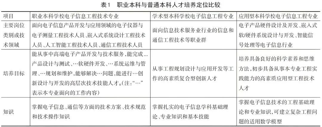 首先,对学生就业岗位定位不同,职业本科更侧重实际生产、设备操作等岗位,主要面向电子信息产品开发与应用领域各类工程技术工作岗位。其次,对学生培养目标定位不同,职业本科培养高层次技术技能人才。三类教育的人才定位都突出“高”,但人才口径各有差异——学术型本科强调创新素质、复合能力,应用型本科强调具有较强的工程实践能力、解决复杂工程问题能力、生产技术管理能力等;职业本科强调应用和操作,聚焦具体工作内容的技术服务、技术开发设计、规划与维护等。再次,对学生知识结构要求不同,职业本科除掌握本科层次要求的宽厚的基础理论知识外,更强调掌握电子信息、通信等领域的技术方案、技术规范和技术操作知识。
