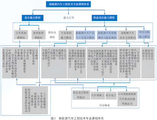 以钢铁智能冶金技术专业为例,展现学校构建的课程体系。河北省是钢铁大省,学校是冶金类特色学校,课程开发过程中,学校深入调研了包括河钢、宝钢等在内的钢铁冶金龙头企业,和企业一起确定专业对接的岗位,明确这些岗位中,专科应该干什么,本科应该干什么?最后形成对应课程。图1展现了从普通钢种的一线生产操作转向高品质特殊钢种的工艺设计及复杂生产操作,出现的工作任务与知识能力要求的递进。图2是对照岗位开发形成的新能源汽车工程技术专业完整的课程体系。