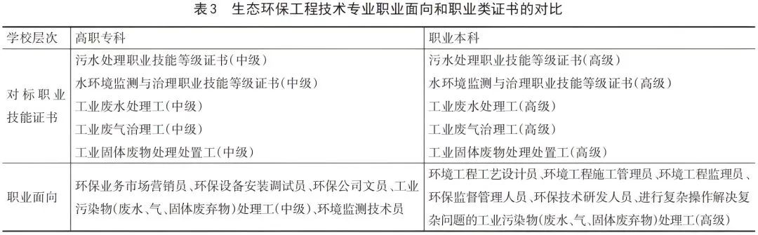 一是明确提出了人才培养方案制订要体现差异与深化。与普通本科横向对比,主要看逻辑起点,深入研究与学术本科、应用型本科在人才培养目标定位、就业面向、培养路径上的差异;与高职专科纵向对比,主要看专业升级,深入研究高职专科与职业本科纵向贯通的实现途径,各阶段人才培养目标定位、课程体系、教学内容等有效衔接。表3是学校生态环保工程技术专业制订人才培养方案时,基于专本一体化设计思想,开展的职业类证书与职业面向的本专科对比。