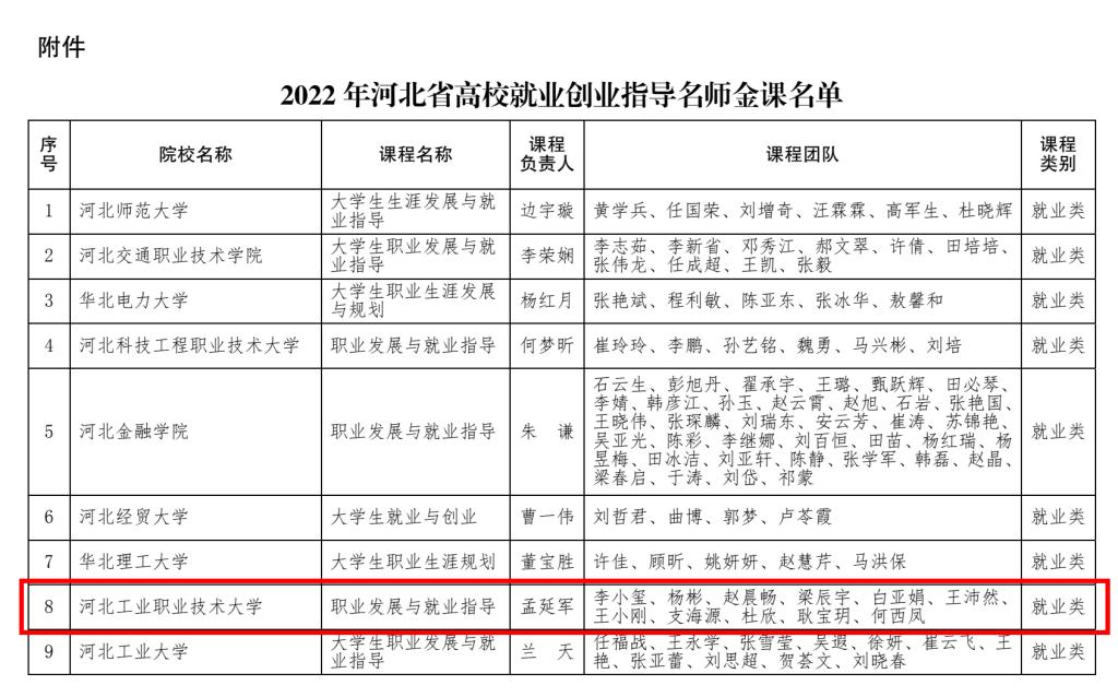 近日,河北省教育厅开展2022年河北省高校就业创业指导名师金课建设工作,经全省各普通高校推荐、专家评审、结果公示等相关工作程序,共有10门就业类和10门创业类课程入选2022年河北省高校就业创业指导名师金课,乐鱼网页版《职业发展与就业指导》、《创新创业基础》分别入选就业类和创业类指导名师金课。