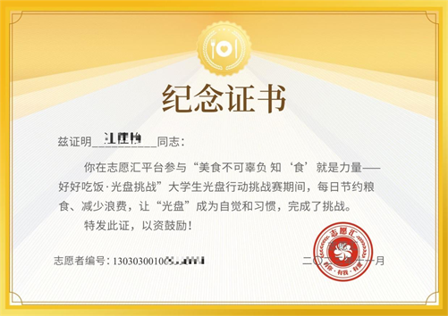 本次活动通过志愿汇发起,以光盘打卡接力赛形式开展,同学们在用餐光盘后拍摄“光盘”行动照片,上传至小程序进行打卡接力。本次活动以同学们喜闻乐见的方式,分享节粮技巧、深化节粮意识,并实际践行节约粮食的良好习惯。在活动期间,乐鱼网页版学生打卡次数达到26000余次,在全国高校热榜中排名第三,900余名学生获得平台发放的纪念证书。