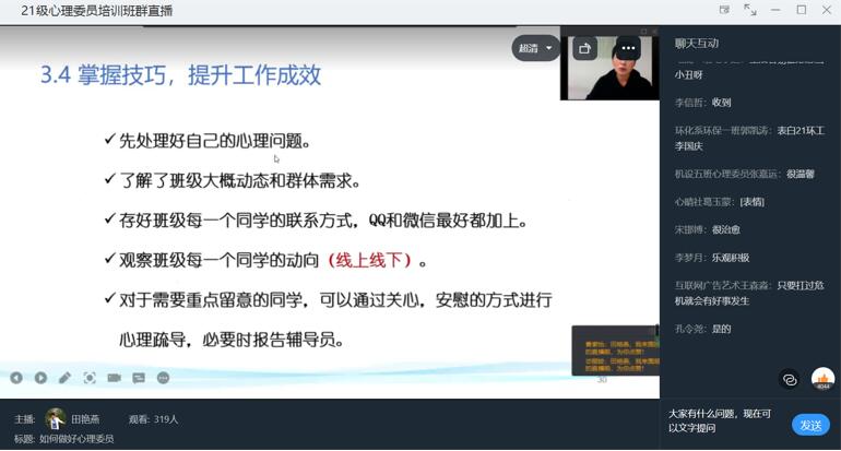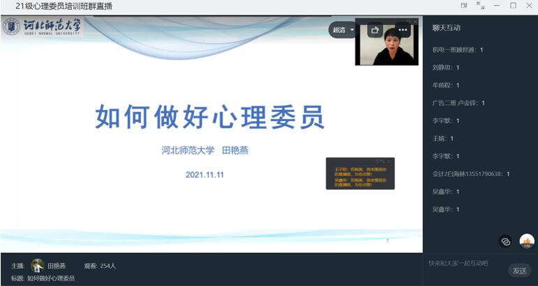11月11日晚,2021年心理委员培训第二场讲座在钉钉平台线上开展。河北师范大学心理健康指导服务中心主任田艳燕老师为大家带来“如何做好心理委员”专题讲座,2021级各班心理委员、心晴社成员在线聆听。
