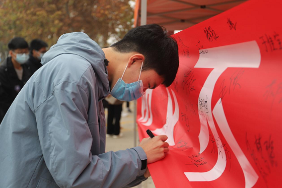 学生在主题宣传横幅接力签名