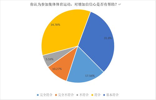 本年度中,将近84%的同学表示参加体育运动,可以增强自信心。通过集体活动,同学们能够主动或者经过一段时间接触融入集体环境,在与同学的交流交往中,不断提高自信心。