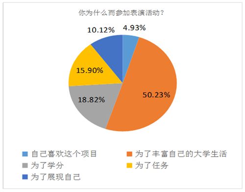 65%的学生参加集体表演是以自身兴趣爱好以及丰富大学生活为出发点,体现出同学们的积极性较高,60%以上的同学愿意主动展现自己,说明同学们的全面发展意识增强。