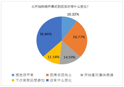 63%的同学认为从开始排练开幕式到现在感觉到开心,甚至更加积极想要参加类似活动。53%的同学认为参加排练以来自己变得更加积极乐观,逐渐开始喜欢集体活动。