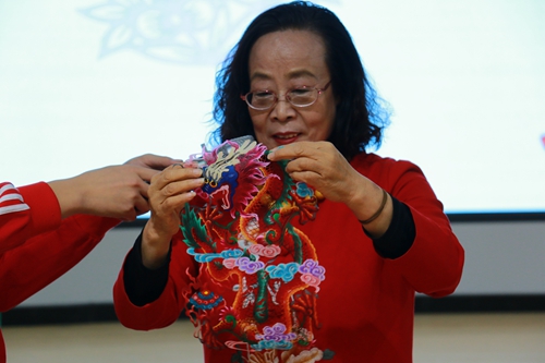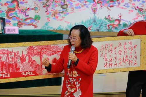 蔚县剪纸艺术是在方寸之间刻画形象生动、富有神韵的图案,周淑英老师首先结合自己的创作经历,以“蔚县剪纸艺术的欣赏与实践”为主题,向在场师生讲述了自己从接触剪纸、爱上剪纸到开创多种技法的学艺和实践经历,展现了一名非遗传承人“守正”与“创新”的精神品格。随后周老师拿出精心挑选的《祥龙送福-九龙图》《五牛神图》《美丽冬奥》《西柏坡五大书记》等代表作品,在师生共同欣赏匠心之作的同时,分别讲解了作品的创作理念、题材背景、剪纸技艺,展示并阐述了极具中华民族特色的吉祥元素、西柏坡红色革命精神、北京冬奥会的冰雪故事。交流中,周老师拿出一把剪刀、几页红纸,一双灵巧的手上下翻飞,纸屑纷纷落下……就这样,一只蝴蝶形状、配有平鸽与莲花图案、象征着世界和平的剪纸作品在周老师手中“诞生”。在现场师生热烈的掌声中讲座结束,学生工作部负责人为周淑英老师颁发了“美育大讲堂”主讲人聘书,为后续开展系列特色美育课程打开了一扇窗。