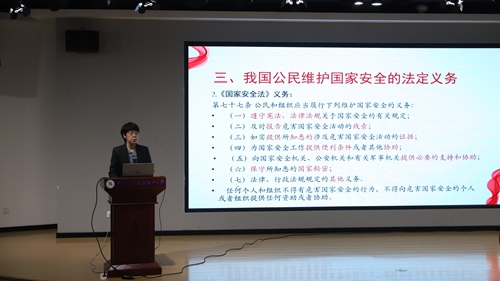 讲座围绕国家安全的内涵、现阶段面临的国际国内形势、履行维护国家安全的法定义务等方面展开讲授,由点到面,结合具体典型案例阐释了新时代国家安全的丰富内涵和外延、当前国家安全工作面临的挑战以及青年大学生应该履行的法律义务。在现场,大家认真聆听,用心感受,气氛热烈而有序。同学们深受鼓舞,纷纷立志要将青春奋斗融入党和人民的事业,不负时代,不负人民,为国家安全与发展贡献青春力量。