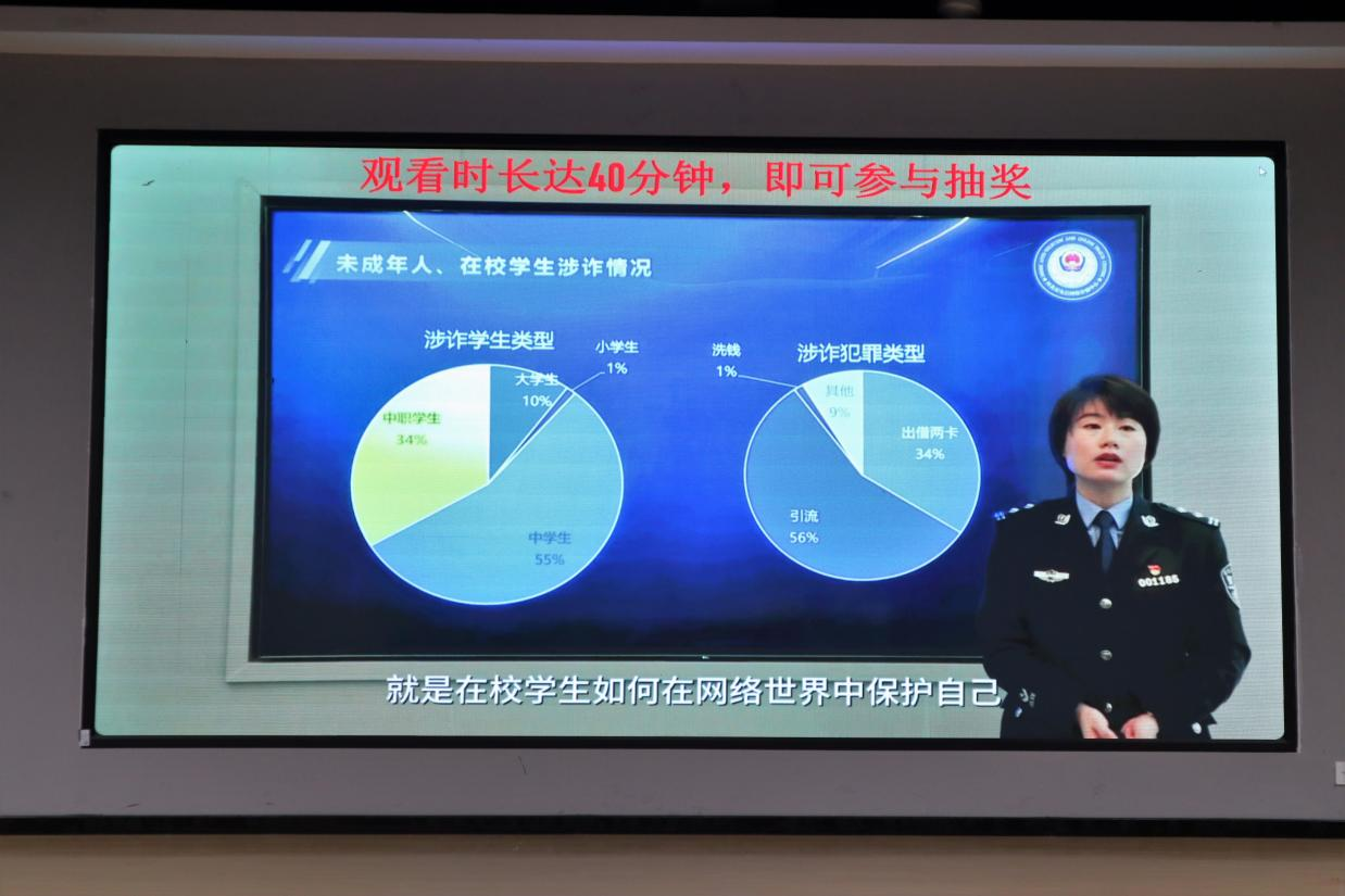 为进一步帮助在校学生群体提高防范电信网络诈骗能力,提升辨别诈骗手段的能力,学校近期组织学生参加了全省在校学生收看反诈知识学习讲座的活动。讲座由警方反诈专家主讲,学校近四千学生参与。