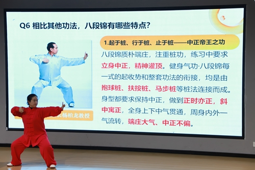 讲座伊始,赵老师带领听众追溯了八段锦的千年传承脉络。她指出,这一传统导引术起源于西汉,马王堆汉墓出土的《导引图》中已可见其早期形态。赵老师引用国医大师邓铁涛的评价,强调八段锦“简单易学、益处良多”,点出其历久弥新的健身价值。在讲解理论的基础上,赵老师进一步提供了实用的练习指导。她建议初学者先熟练掌握动作,再逐步配合呼吸,练习时宜保持心平气和;时间上以早晨或午后等安静时段为佳。同时,她也提醒大家注意练习禁忌:急性脊柱损伤、严重器质性疾病患者等人群不宜练习。此外,练习前后的准备活动与收尾调理同样重要,规范姿势才能达到事半功倍的效果。在互动交流环节,同学们积极分享学习心得。一位同学谈到:“以往我只将八段锦视为简单的养生操,通过讲座才认识到其中蕴含的中医经络学说与气血调理智慧。”另一位同学则指出:“老师讲解的科学练习方法特别实用,特别是练习前后的准备与放松环节,以及动作细节的规范要求。过去我忽略了这些要点,练习时总感觉不得要领,现在终于找到了问题所在。”