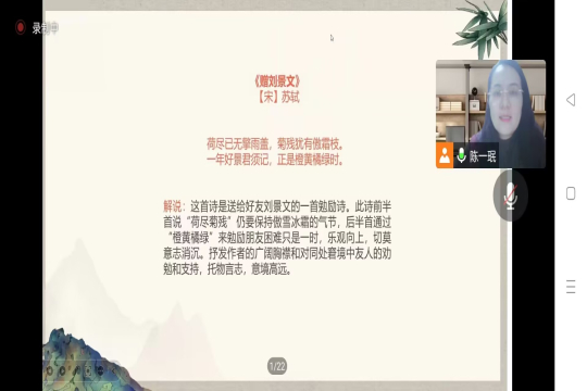 赏中华诗词,寻文化基因,品生活之美。1月6日晚,马克思主义学院陈一珉老师通过腾讯会议线上授课方式,带领同学们走进古诗词海洋,感受古诗词中蕴含的色彩魅力。