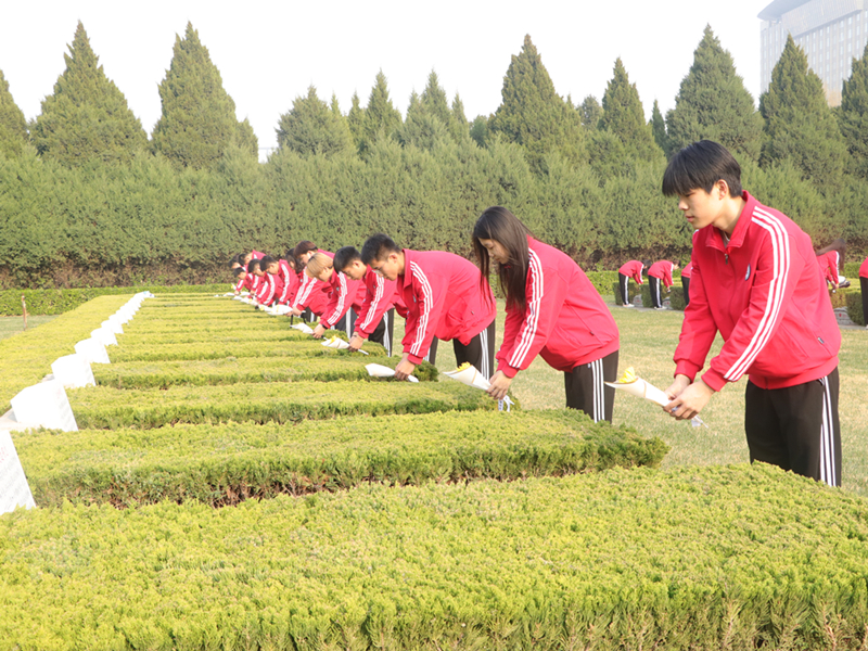 仪式结束后,全体师生用双手捡拾烈士陵园的落叶、拔掉杂草,用洁白手帕擦拭墓碑并敬献鲜花。