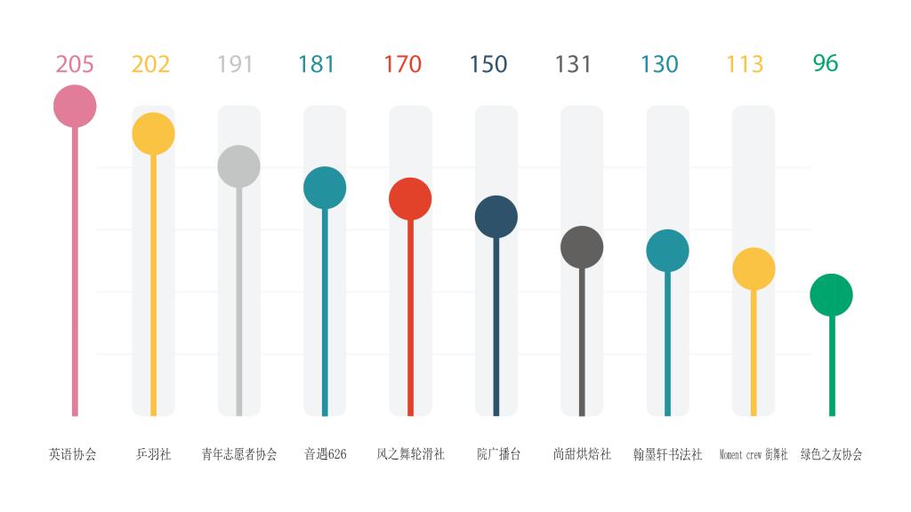 纳新人数排名前十的社团,分别是英语协会、球类爱好者协会(乒羽队)、青年志愿者协会、音遇626声工厂、风之舞轮滑社、广播台、尚甜烘焙社、翰墨轩书法社、Monment Crew街舞社、绿色之友协会。
