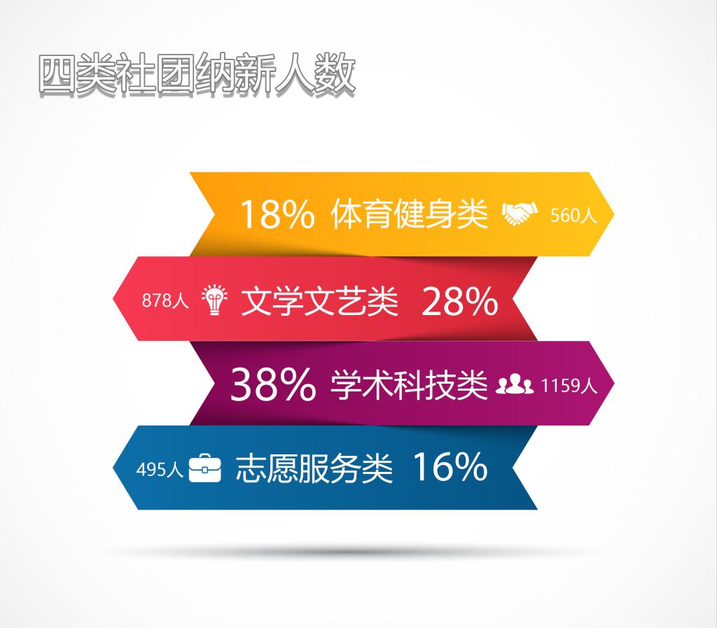 新生对学术科技类社团最感兴趣,有1159人报名加入,占纳新总数的38%;其次是文学文艺类社团,有878人报名加入,占纳新总数的28%。