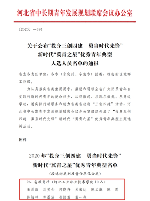近日,由共青团河北省委、河北省中长期青年发展规划会议联席办公室联合组织开展的2020年“投身三创四建 勇当时代先锋”新时代“冀青之星”优秀青年典型主题选树活动圆满结束。自该活动启动以来,学院团委高度重视,广泛动员,周密组织,历经系部推荐、学院评选、上级主管部门审核等环节,我院教师刘笑含、何晓卉、陈思、郭墨涵、崔阶萱、吴宏达,学生王辰雨、陈孟赢、陈炳林、董一森共计10名师生荣获河北省“冀青之星”荣誉称号。