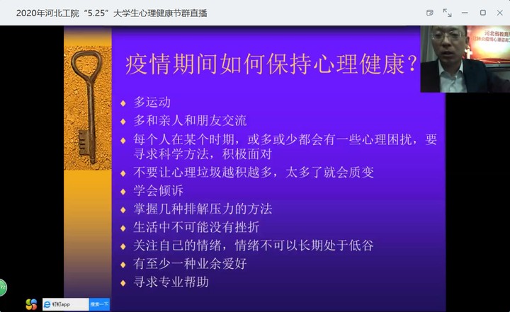 为加强疫情期间对同学们的人文关怀和心理疏导,5月12日晚,2020年“5·25”心理健康节首场活动在钉钉平台线上举办,我院邀请到河北医科大学心理健康教育研究与咨询中心负责人王锃老师为同学们做“聚力同心·战‘疫’同行”心理专题讲座。心理健康教育服务中心负责人、各系心理负责老师、班级心理委员、心晴社成员、学生代表线上观看。
