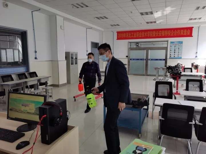 支部委员定期对实训车间进行消毒作业
