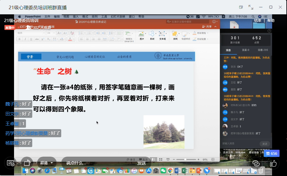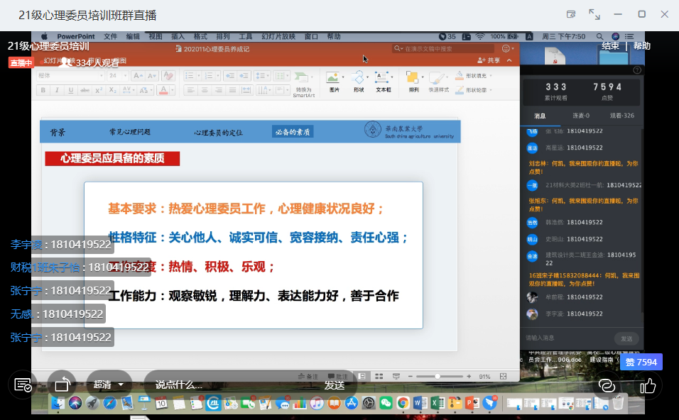 心理委员充当着班级同学的知心伙伴的角色,是一个健康班级不可或缺的存在。11月10日晚,2021年心理委员培训第一场讲座在钉钉平台线上开展。本次讲座乐鱼网页版有幸邀请到广东省大学生心理健康教育与咨询工作室主持人、华南农业大学何凯老师为大家做“心理委员养成记”专题讲座,2021级各班心理委员、心晴社成员在线聆听。