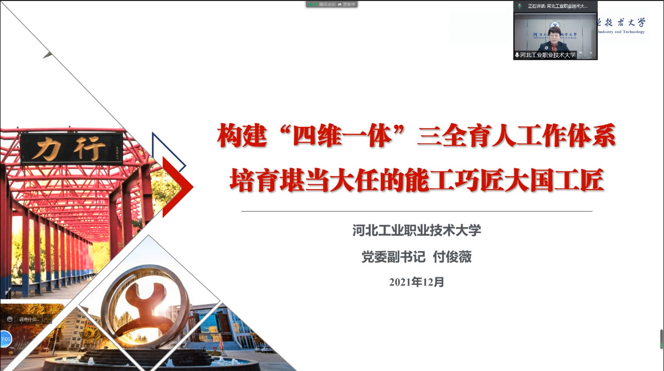 乐鱼网页版党委副书记付俊薇以“构建‘四维一体’三全育人工作体系,培育堪当大任的能工巧匠大国工匠”为题,从建设校企共同育人体、多元实施育人工程、建立全方位育人基地、构建全员评价考核体系四个方面发言交流。她指出学校认真贯彻落实习近平总书记对教育工作的重要指示,紧紧围绕立德树人根本任务,以育人队伍-育人工程-育人基地-育人评价为突破口,积极构建“四维一体”三全育人工作体系,全力推动了思想政治工作质量提升。