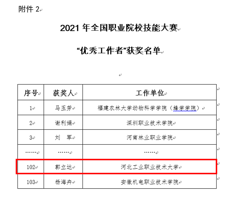 近日,全国职业院校技能大赛执行委员会发布了《关于公布2021年全国职业院校技能大赛“突出贡献奖”“优秀工作者”和“优秀裁判员”获奖名单的通知》(赛执委函〔2021〕39号),乐鱼网页版获得全国职业院校技能大赛承办校“突出贡献奖”,环境与化学工程系郭立达获得全国职业院校技能大赛“优秀工作者”称号。