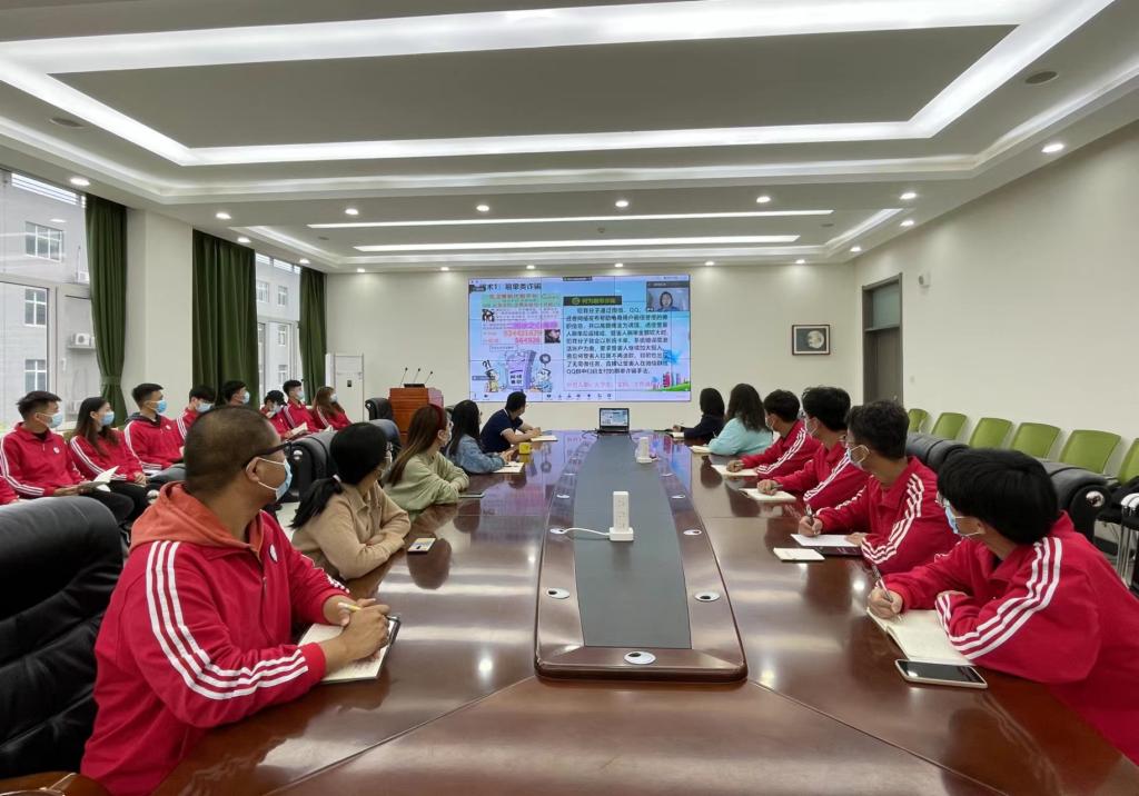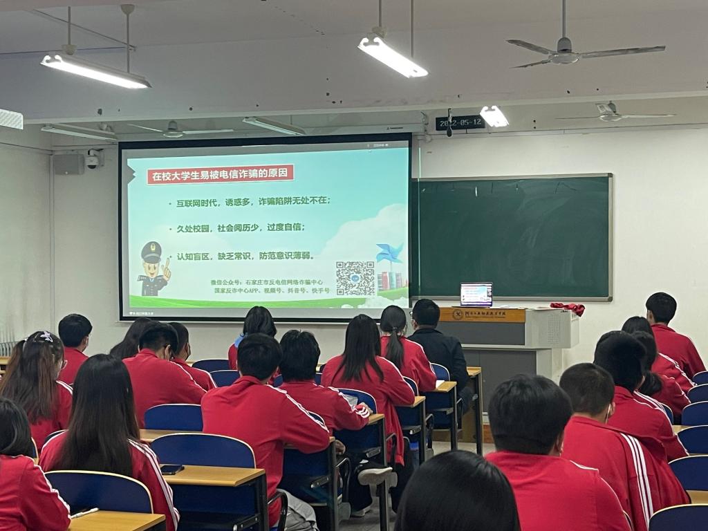 为落实河北省教育厅《关于开展“冀网同心 全民反诈”宣传活动的通知》文件精神,增强广大师生的识骗、防骗意识和能力,加大防范电信诈骗的宣传力度,有效防范各类电信诈骗事件的发生,5月12日下午,学校举办防电信诈骗知识宣传线上专题讲座,主会场设在学校“一站式”学生社区综合管理中心,各院系设立分会场,各院系党总支副书记、团总支书记、政治辅导员和骨干学生一同观看学习。