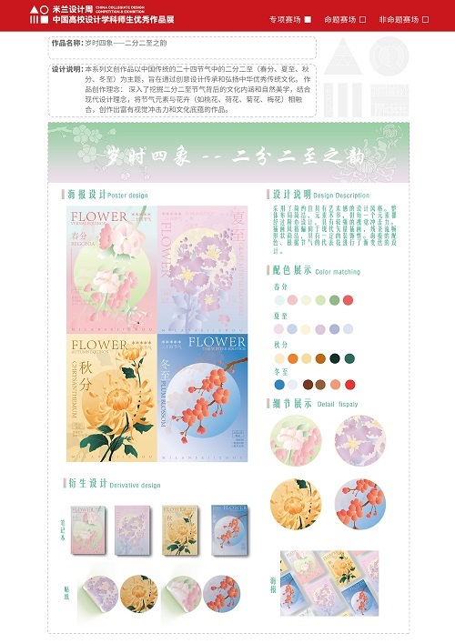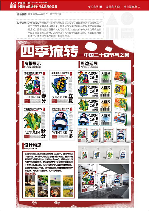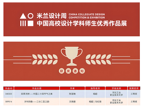 米兰设计周--中国高校设计学科师生优秀作品展,作为教育部认定的56项高校学科竞赛A类赛事之一,由中国教育国际交流协会、中国高等教育学会联合主办。该赛事旨在真实反映新时代背景下我国设计学科教学水平的现状和教学成果,为全国艺术学科师生搭建展示专业才华和创作水平的国际化交流学习平台。该赛事迄今已成功举办8届,总计收到全国1300多所高校师生报名作品38万余件,其中在米兰展出优秀作品1400余件。此次获奖作品是互联网学院电商教研室美工实战班二年级专业设计课程《文创产品设计》的学习成果。作品以中国传统二十四节气为核心,通过创新设计将二十四节气文化融入文创作品中,旨在诠释二十四节气的文化魅力,以时代精神激活节气文化的生命力。